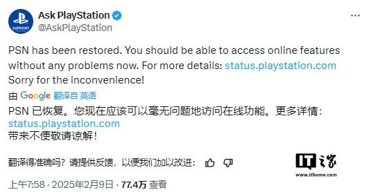IT 世家 2 月 9 每日消息,正在经历超级 24 在小时中断之后,PlayStation 最后,网络服务再次恢复正常。