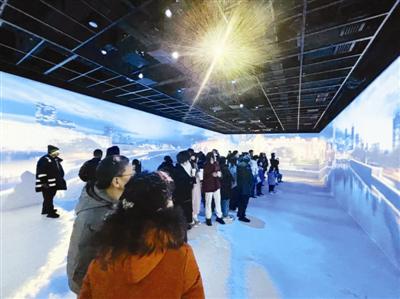 "哎哟,我是怎么后退的?拉住我!"地下一层 5D 在电影院里,沉浸在电影中的小学生琳琳被动态画面带进来,以为脚下的“甲板”动了,赶紧抓住旁边同伴的手,才发现原来是参考不同带来的视觉错觉:“刚进来的时候,四面和地面都是纯白色的油漆,然后海水把我们泡在里面。后来随着港口和船只的出现,港口的形成和天津港的发展故事慢慢被描述出来。十分钟的电影不知不觉就看完了,感觉自己是在时间的河流中游来的,这种感觉太奇怪了!" 5D 影院是“津港印象”最具新鲜感的空间,也是古今文化交融的聚集地。