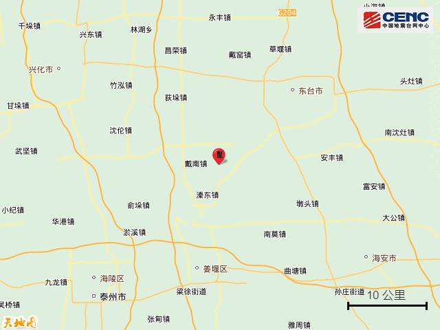根据中国地震台网的正式测量,2 月 9 日 7 时 0 分发发生在江苏泰州市兴化市。 3.0 级地震,震源深度 8 震中位于北纬,公里 32.72 度,东经 120.17 度。