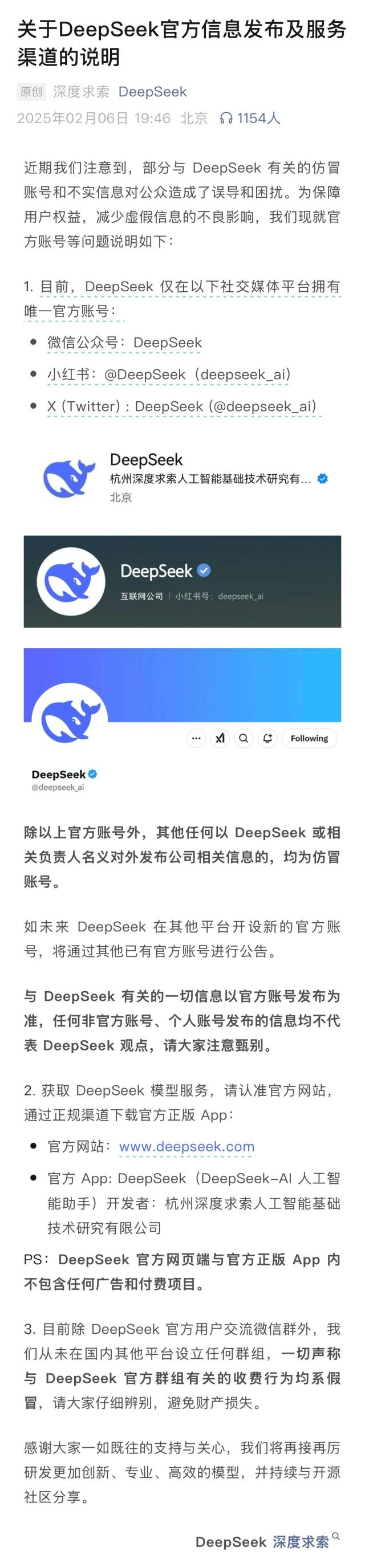 6 日晚,DeepSeek 官方帐户发表声明。声明说,目前,该公司仅在微信公众号、小红书等三个社交平台上拥有唯一的官方帐号,且 DeepSeek 官方网页端和官方正版 App 不包括任何广告和付费项目。