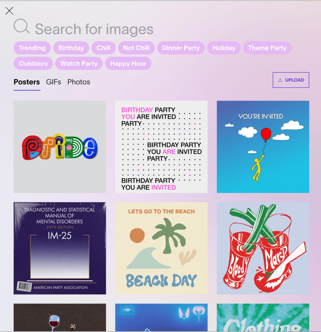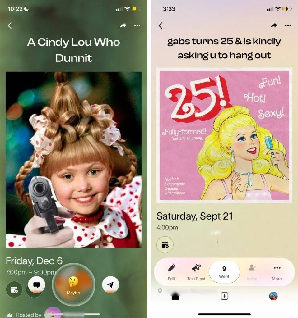 对比 Evite、Facebook Events 这个功能相似的老平台,Partiful 选择的设计语言更加时尚,提供的聚会主题是当今网络上流行的话题。