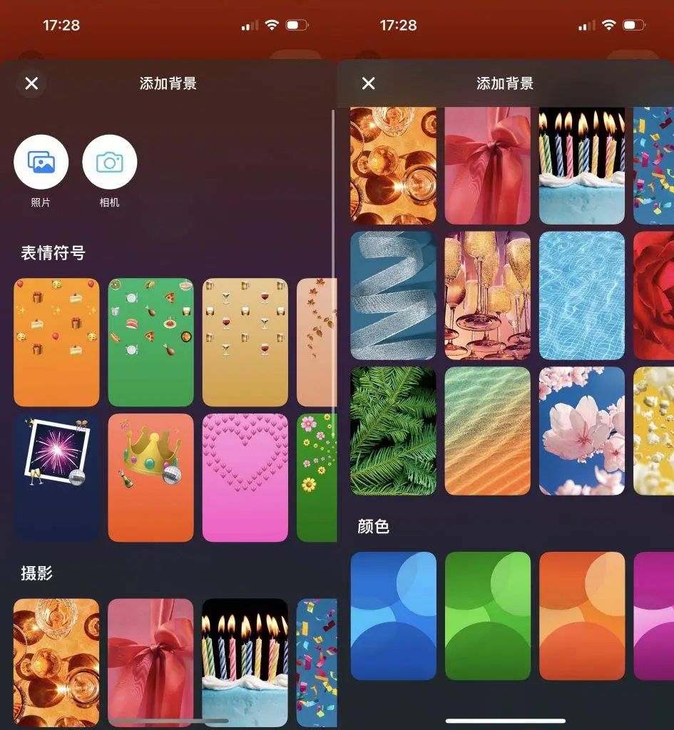 除了自选的图片,苹果还提供了三个主题的背景图片:表情符号、拍摄和色彩。如果是支持的话。 Apple 智能型号,也可以根据需要现场生成合适的照片。