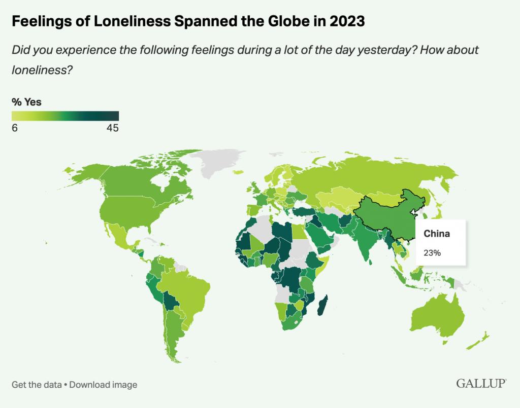 按照盖洛普对全世界的看法 22 调查个别国家和地区,总的来说,有超越 30% 成年人表达自己「感到孤独」,虽然中国的平均水平低于平均水平,但也有比例。 23%,可以说四个中国人中就有一个伴随着孤独。