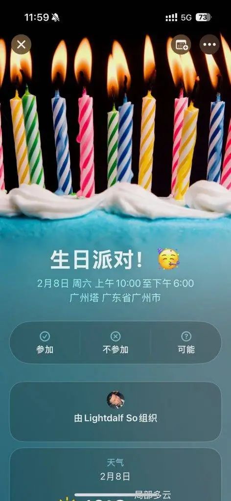 非常贴心的是,如果发起人一起附上了活动地址,邀请函不仅可以显示定位,还可以显示当天、当地的天气状况供参考。