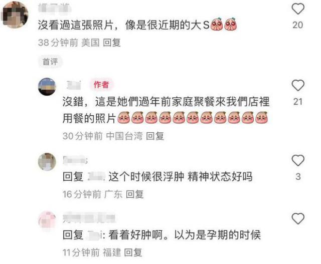 餐厅老板在评论区与网友互动时表示,这是过年前, S 一家人来他们餐馆聚会时拍摄的照片,换句话说, 1 拍摄于月底。