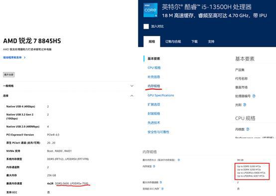 那么我们就一起来谈谈吧,首先升级内存需要查询自己的型号支持的最高频率,打开 AMD 或者英特尔官网,找出相应的处理器型号,并在规格目录中给出相应支持的最高内存频率(注意,LPDDR 是板载内存,DDR 就是插槽内存)。