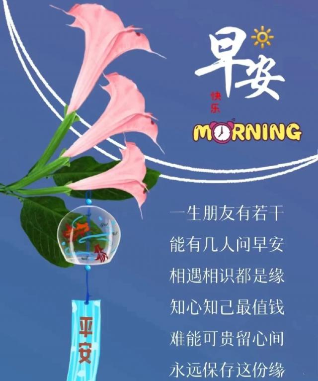 清新的微风中有悠悠的云,悠悠的云中有淅淅沥沥的雨滴,淅淅沥沥的雨滴中有淡淡的诗,淡淡的诗中有浓浓的思念,浓浓的思念中有绵绵的祝福,绵绵的祝福中有源源不断的幸福和幸福。早上好,真诚的祝福传递给你,祝你幸福快乐!