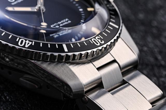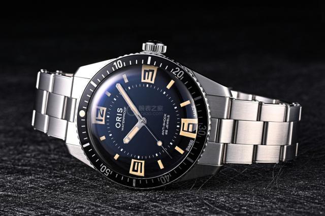 这一年是豪利时 Divers 诞生 60 这个全新的周年纪念日 60 周年纪念版不仅能让人立刻联想起来 1965 年元祖款,还是比较的 2015 年复刻版做了很多细节调整。第一个最引人注目的类似细节自然是 3、6、9 、12 位置包含大号阿拉伯数字时标的小夜光涂层,甚至防水标志都回到了豪利时代。 Logo 下面,这样做不但与元祖款保持一致,更重要的是,它确实比元祖款更重要。 2015 在同一位置的那一行 Automatic 高级太多。除了防水标志,抗震标志和晶石数量标志也与元祖模型一致。当然,由于这款手表采用了自动机芯,晶石的数量自然不可能是元祖模型。 17 颗粒,而今天的颗粒 26 颗。尤其需要注意的是,这次豪利时。 Logo 居然还用了一种比元祖款看起来还古老的字体,然后瞬间让款表的古董味道再浓一点。