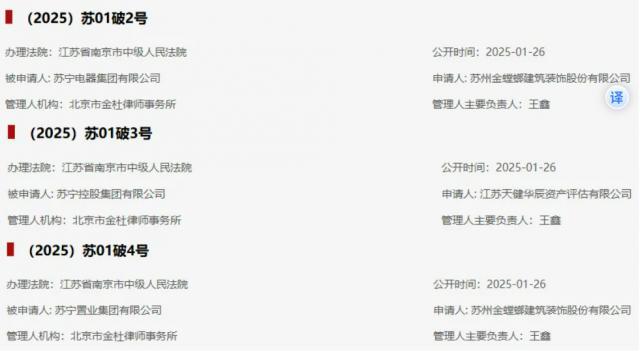 2 月 7 日,苏宁电器集团有限公司、苏宁控股集团有限公司、全国企业破产重整案例信息网发布。 苏宁置业集团有限公司破产重整案件信息与一债会公告,三家公司于 2025 年 1 月 26 日南京市中级人民法院受理破产重整,案号分别为(2025)苏 01 破 2 号、3 号、4 号。