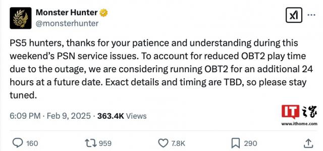 IT 世家 2 月 10 因为索尼旗下的日消息, PlayStation 本周六,网络遭遇了近一天的中断故障,直到今天早上才修复,导致游戏《怪物猎人:荒野》的第二次修复。 Beta 第一次测试的时间变短了。目前,卡普空宣布将为游戏公测提供额外的测试。 24 小时测试时间。