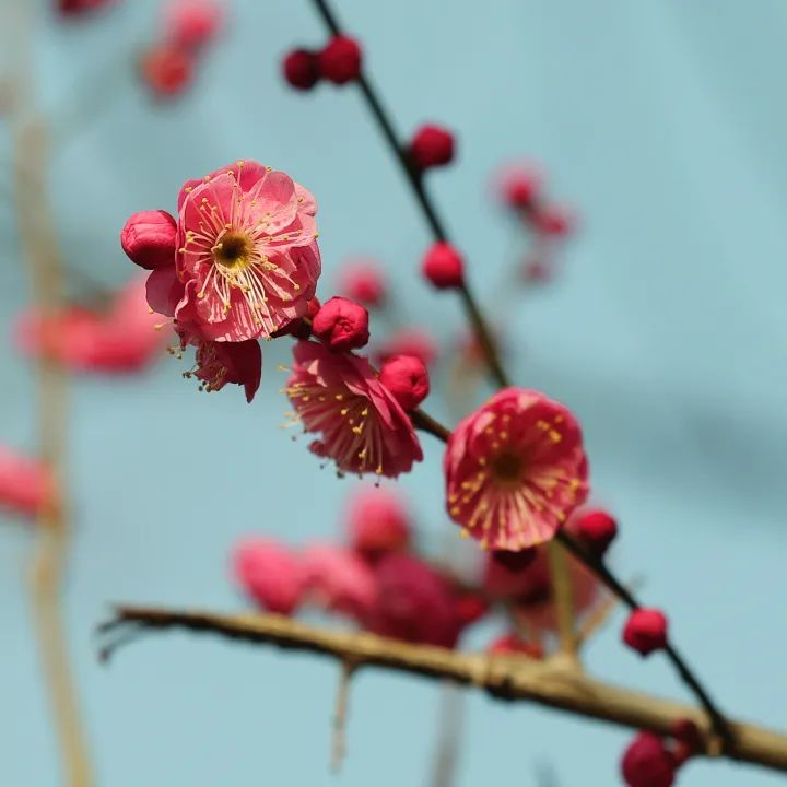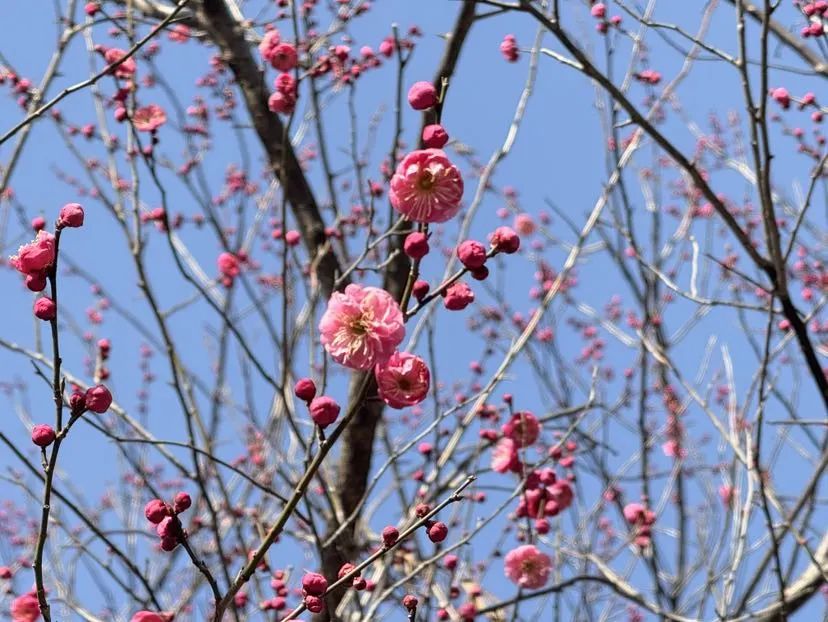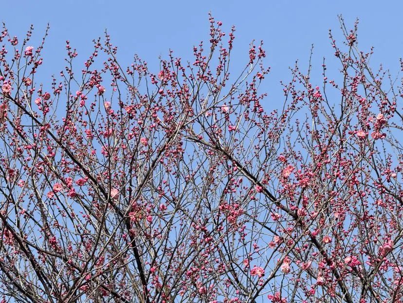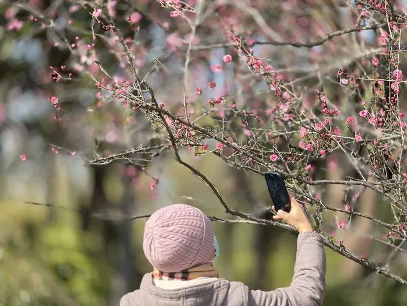 走进顾村公园,梅樱林内呈现出动人的画轴:红梅如火,粉梅如霞,白梅胜雪,枝头或娇羞半绽,或盛开。尽管天气寒冷,赏梅游客络绎不绝。来自嘉定的戴慧芳妇女特意乘坐早班地铁,在红梅树下频繁举起手机。尽管天气预报说今天零下5℃,但是看着这些傲慢绽放的花朵,晒着温暖的阳光,整个人都伸展开来。”戴女士告诉记者,她每年都要来记录顾村公园的“花期接力”。