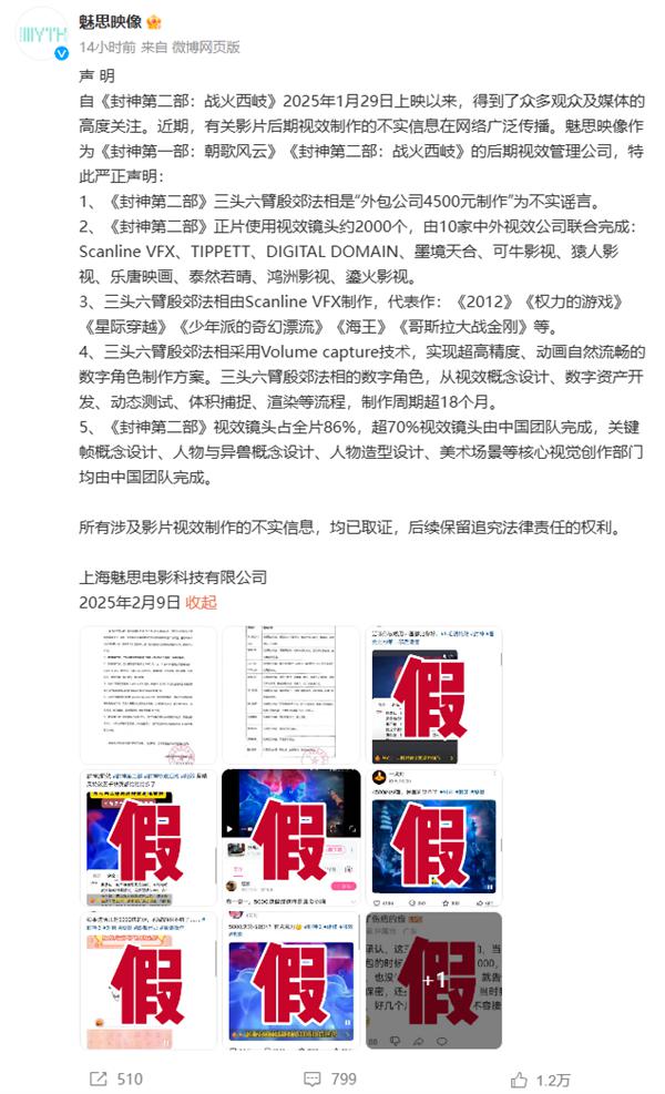 魅思形象称,《封神二部》三头六臂殷郊法相是“外包公司 4500 “元制作”是一个虚假的谣言,三头六臂殷郊法相由 Scanline VFX 制作。