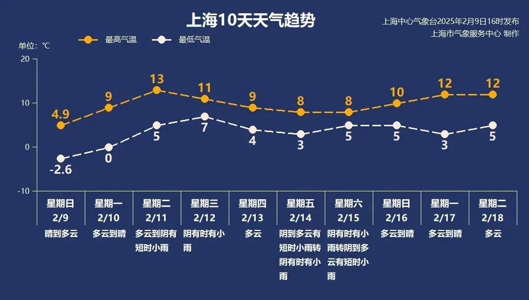 随着暖湿气流的增加,上海明天的气温已经上升到最近的高点,一整天都在5~13℃之间,随之而来的是短暂的小雨。12日受冷空气扩散影响,气温开始下降,天气阴雨交加。13日,天气短暂放晴,14~15日再次迎来小雨,整体雨势不强。