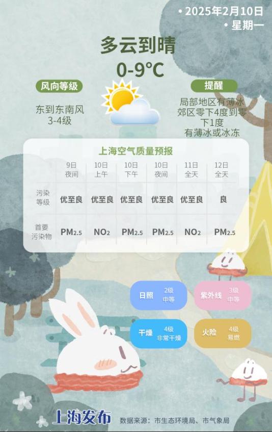 今日多云至晴,市区最低气温为0~1℃,局部为薄冰,郊区最低气温为零下4℃至零下1℃,有薄冰或冷冻,最高气温为9℃。东至东南风3~4级,相对湿度为85%~35%。