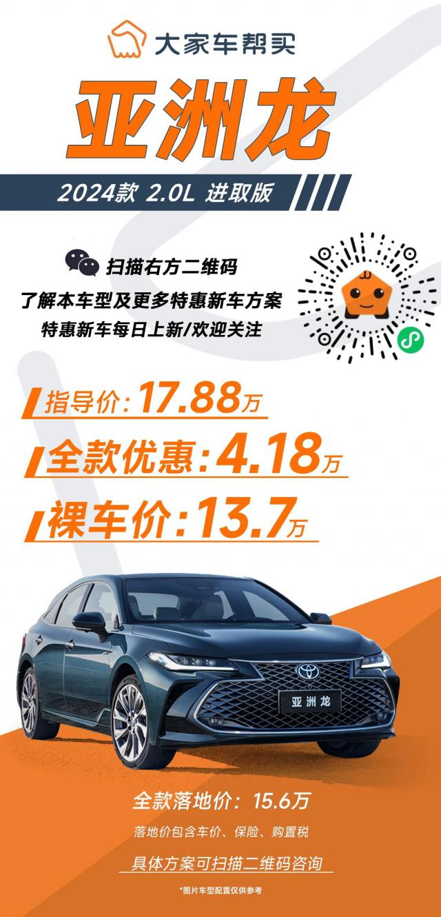 谈到丰田家族 B 级车,也许现在还有人对凯美瑞还是有印象的。 20 一万左右,亚洲龙要贵一点,但是从去年年中开始,凯美瑞的双引擎版就已经在了。 15 一万个区间,燃油版更是如此。 13、4 万能落地。今天的主角——亚洲龙,作为一个定位“准确” C “级别”轿车,以高半级定位,也直接杀入。 15 万这个价格!并且是全款优惠!