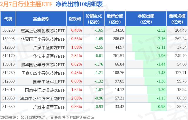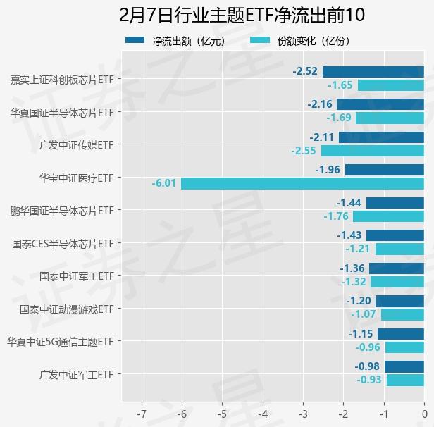当天有 239 只行业主题 ETF 资金净流出,其中嘉实上证科技创新板芯片净流出排名第一。 ETF(588200),份额下降 1.65 一亿份,净流出额为 2.52 亿元。