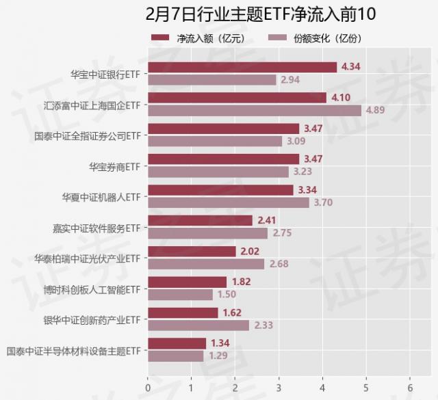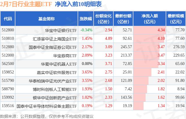 当天有 118 只行业主题 ETF 资金净流入出现,其中华宝中证银行净流入排名第一。 ETF(512800),份额增加 2.94 十亿份,净流入额为 4.34 亿元。