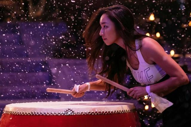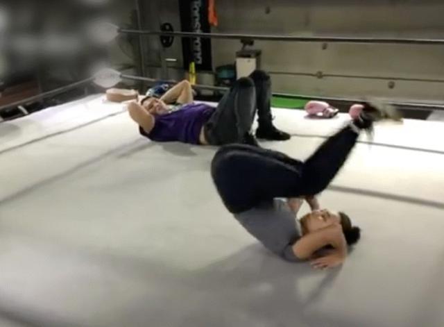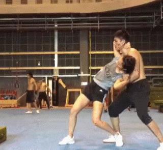 在一个幕后花絮中,她跳起来,一个干脆利落的背摔,把一个成年人倾倒在地。