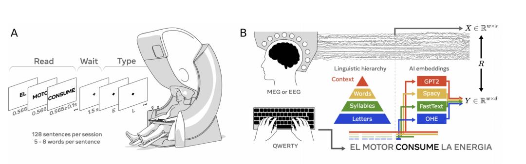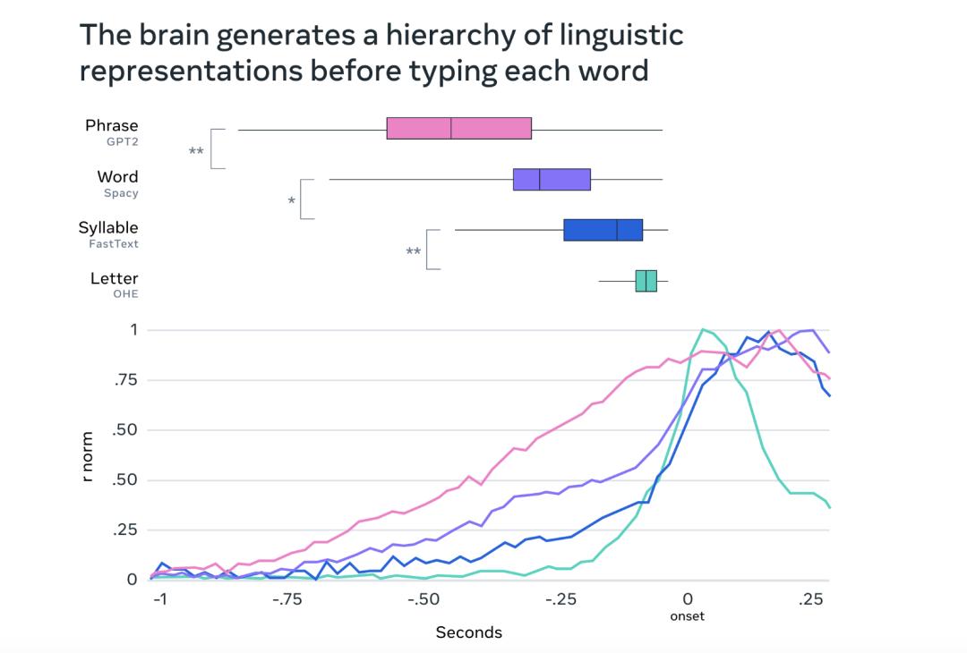 为了探索大脑如何将想法转化为复杂的运动动作序列,Meta 团队使用 AI 帮助解释参与者输入句子时的 MEG 信号。通过每秒拍摄 1000 张大脑快照,他们能够精确定位思想转化为单词、音节甚至单个字母的准确时刻。