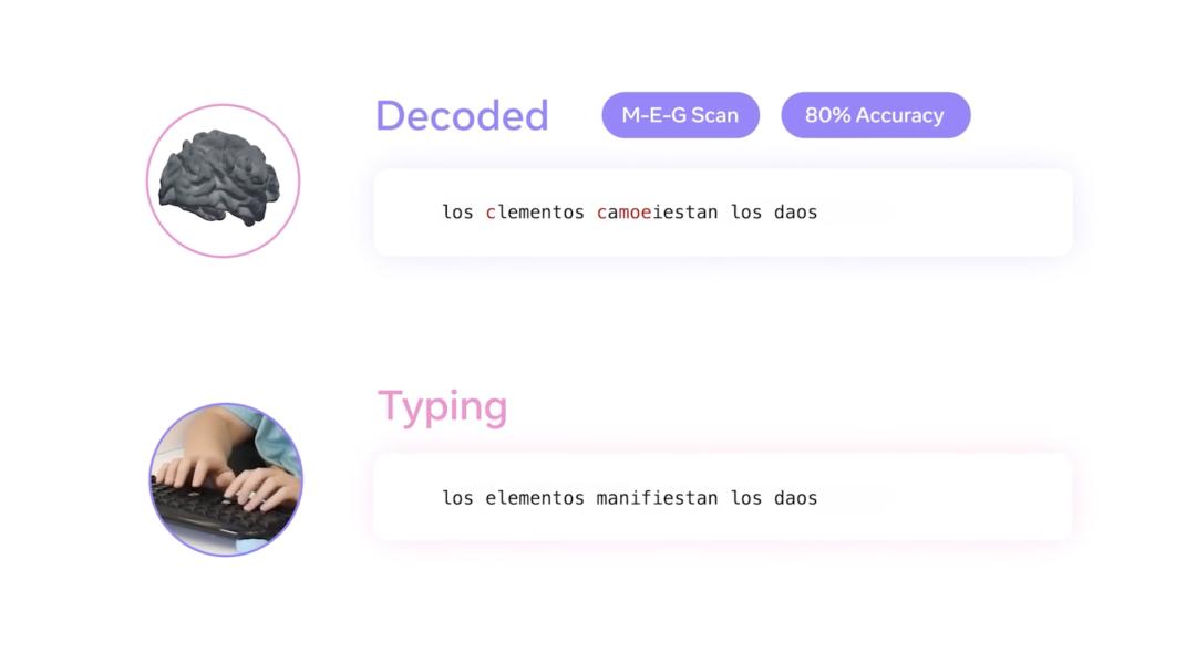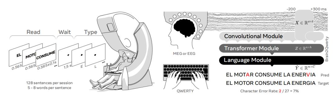 他们训练了一个新的 AI 模型,可以解码来自脑电图(EEG)或脑磁图(MEG)的句子,参与者则在 QWERTY 键盘上输入简短的句子。该 AI 模型可以解码参与者用 MEG 记录输入的多达 80% 的字符,平均字符错误率(CER)为 32% ,大大优于传统的 EEG(CER:67%)。对于表现最佳的参与者,该模型实现了 19% 的 CER,并且可以完美解码训练集之外的各种句子。