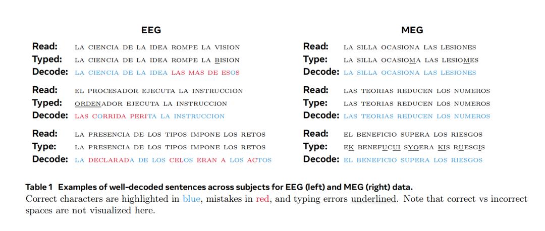 图|解码表现较好的 EEG 和 MEG 文本对比,正确解码字符标为蓝色,错误为红色