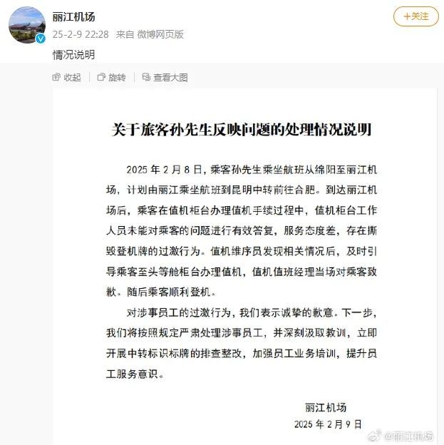丽江机场表示,2025年2月8日,乘客孙先生乘坐航班从绵阳到丽江机场,计划从丽江乘坐航班前往昆明中转合肥。到达丽江机场后,乘客在值机柜台办理值机手续时,值机柜台工作人员未能有效回答乘客的问题,服务态度差,导致登机牌撕毁过度。值机维序员发现相关情况后,及时引导乘客到头等舱柜台办理值机手续,值机值班经理当场向乘客道歉。随后乘客顺利登机。