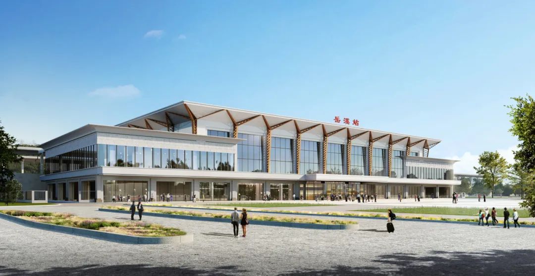 岳溪站位于重庆市开州区,建筑面积6000平方米,站面规模2台4线,为线侧下站房。整个建筑形状对称,与当地文化、环境、习俗、地貌和谐,呈现出宏伟的建筑形态。山形起伏的屋架与硬线的底座相匹配,呈现出轻盈稳定的车站建筑形态。