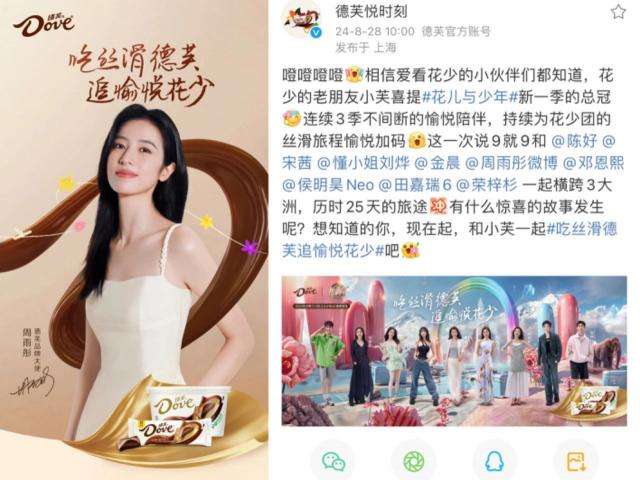 据击壤数据显示,德芙在节目投放期间,日均舆论增长。 10.4%。可以看出,如果投放效果明显,品牌也会增加。 IP 信任更倾向于持续合作。此外,合作品牌还包括:合作伙伴美汁源与科罗娜、指定产品潘婷、滴滴专车赞助、动态区域与山海。