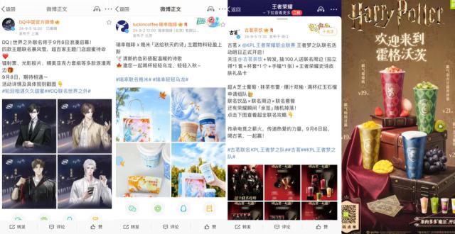 最近,DQ 正式宣布联名乙游《世界之外》;瑞幸联名几米,并预告 9 月 16 日将与潦草小狗联动上线;古茶与 KPL 王梦之队达成联动;奈雪的茶与哈利波特的联合活动持续不久,便正式宣布推出与电子竞技的联动。