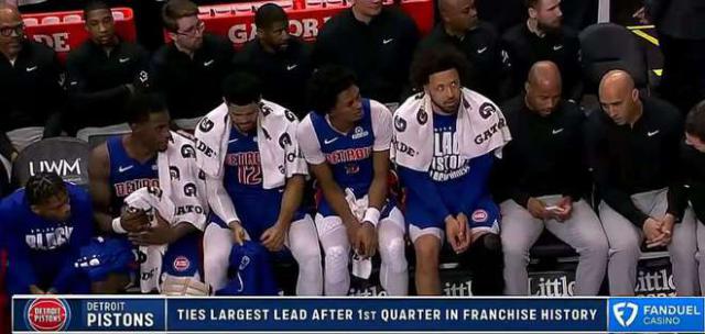 活塞前 52 场 26 胜 26 负面,最后一场主场活塞 125-112 击败 76 人。黄蜂前 49 场 13 胜 36 负面,最后一场主场比赛 117-116 险胜马刺。活塞本赛季前三次交锋, 1 胜 2 负面处于下风。这个活塞缺少艾维,黄蜂缺少米勒,格林,曼恩,格威。在第一节比赛中,活塞很早就表现出了一种反向压力的方式。坎宁安的进攻和传记结合激活了球队的进攻,尤其是比斯利和哈里斯联合起来。 10 中 他们已经轰下了10 25 与黄蜂队相比,分数更高 10 分数,活塞可以轻松滚动第一节获得。 39-15 领先 24 分数巨大的优势,追平队史第一节最大的领先分差记录。