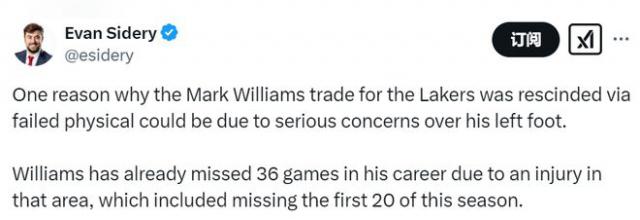 北京时间 2 月 10 日,名记 Evan Sidery 报道了马克 - 更多关于威廉姆斯被湖人队退回的内幕信息,他的左腿受伤令人担忧。另外,Sidery 同时也透露了湖人队今年夏天的两大内线加固目标:克拉克斯顿和特纳。