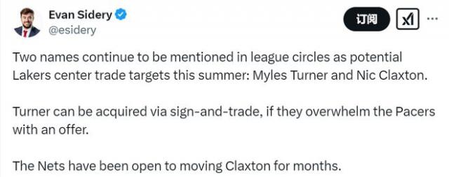 Sidery 他说,如果湖人队给步行者的价格有压倒性的优势,他们可以通过先签后交易获得特纳。在过去的几个月里,篮网一直愿意交易克拉克斯顿。