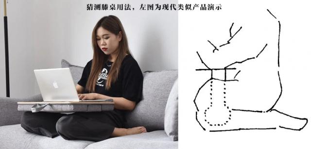那时候出土时,学者们还猜测②:可能夹在膝盖之间当小桌子用。马怡先生说:“怀疑这个装置的底座或者放在人的膝盖之间,面板在你面前,可以依靠。”但是看它的高度,大部分都是最高的。 15 厘米左右,如果小桌子很短,单脚不稳定,两边有弧度,不适合放太多东西,然后根据它的弧度和臀部曲线的一致性来看,不是用来盛放物品的,所以现在猜测偏向是一种坐具。