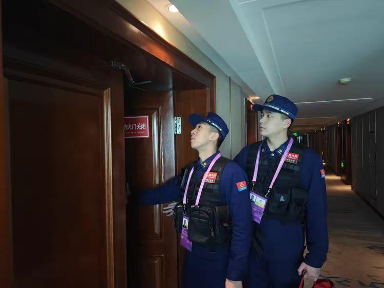 哈尔滨消防救援支队香坊消防大队通站街站派遣 6 名消防员和 1 一辆水箱消防车,和 2 著名监督员入驻北大荒国际酒店。团队成员严格遵守日常生活制度,保持内部清洁,物品摆放有序。值班力量科学划分,检查地下车库、配电室等场所,检查车辆和重点设备的隐患。