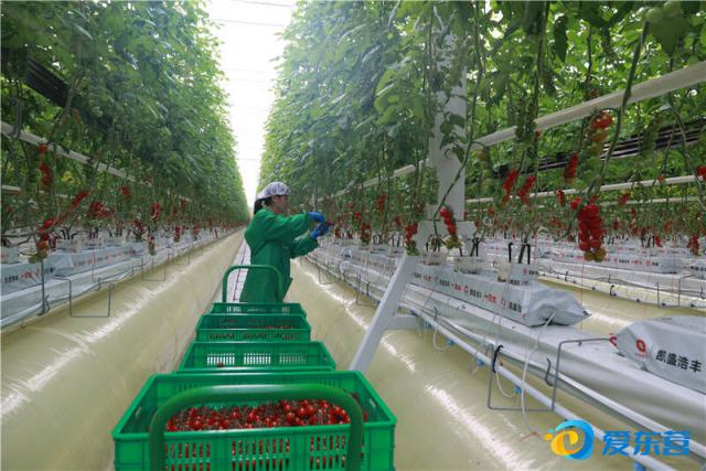 在凯盛浩丰 ( 利津 ) 智能玻璃温室,现代智慧农业示范园, 一万多株樱桃番茄迎来了丰收季节,工人们正在选择收获。记者周广学通讯员丰永梅报道