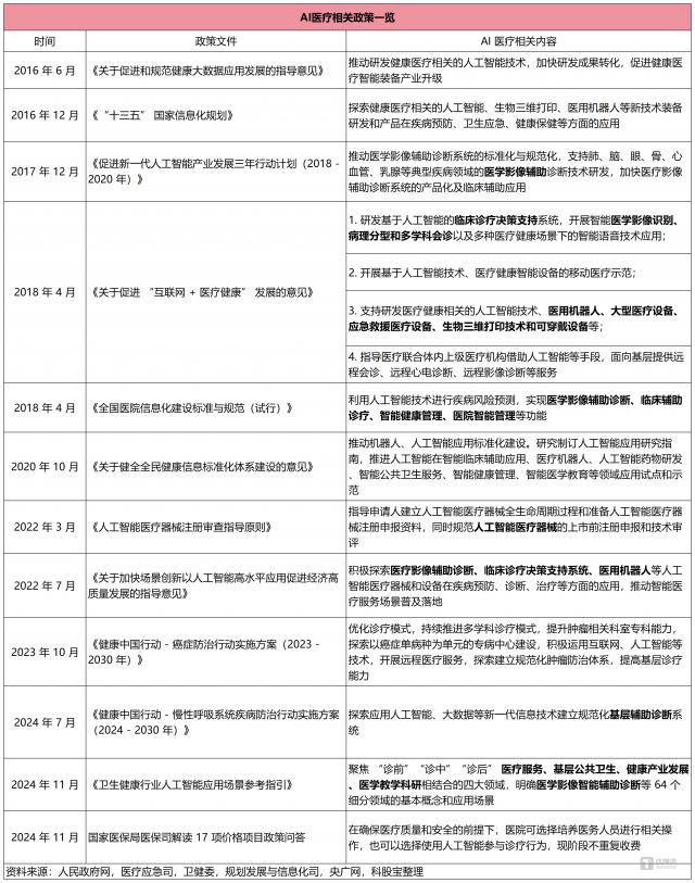 政策方面,自我 2016 2000年以来,中国开始出台促进医疗领域人工智能技术应用的政策,旨在从宏观层面推动医疗行业智能化转型。2024 年至今,随之而来 AI 技术飞速发展,相关政策逐步细化,应用领域日益明确。