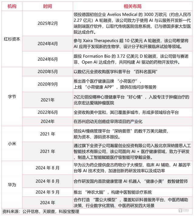 在投融资方面,2025 年 1 月 26 日本,眼科医疗器械研发商佳视诺德获得最新一轮融资,投资方包括高淳创投、勤智资本、磐衡投资等多家机构。根据佳视诺德的成立 2021 年 4 月,从眼科医疗器械及配套耗材入手,产品线包括玻璃切割机、人工晶体、准分子等高端医疗器械设备,旨在打破国外品牌垄断,实现国内替代。另外,红杉资本、字节、小米等企业在 AI 医疗领域也有布局。