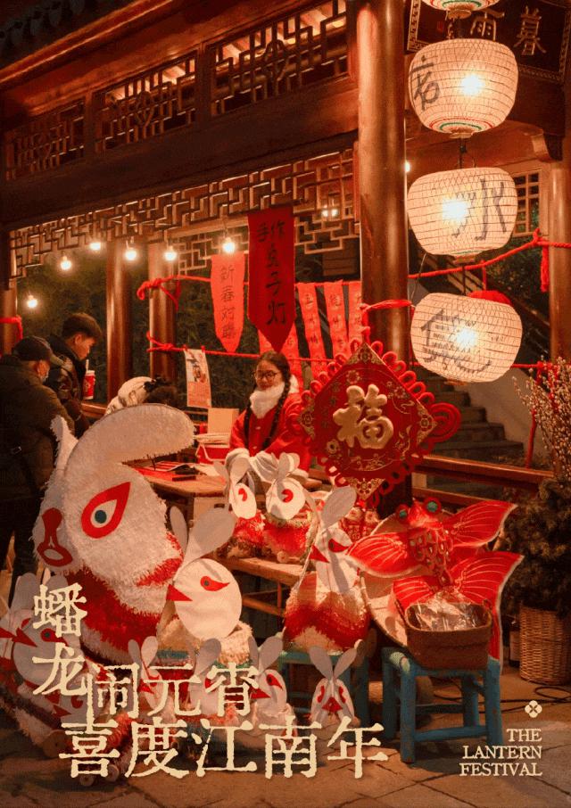 盘龙天地以非彩灯技艺打造江南灯会,在江南水系之间打造巨型水灵蛇“三物”彩灯。巨型蛇灯穿过古桥和街道,结合灯光、舞龙和篝火活动,营造江南水乡的春节气氛。