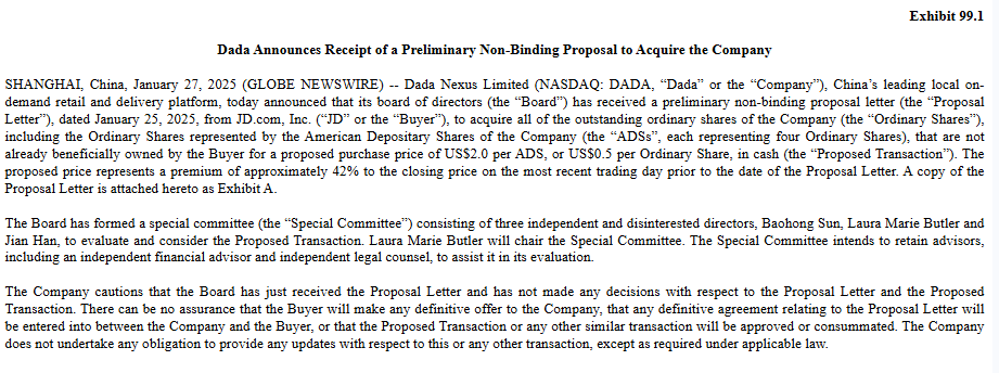 当地即时零售和配送平台达达集团发布公告称,其股东大会已于1月25日收到大股东JD.COM集团发布的初步非限制性收购要约。JD.COM建议每份美国股权存托(ADS)以2.0美元的价格购买达达集团尚未持有的ADS(或每股普通股0.5美元)。