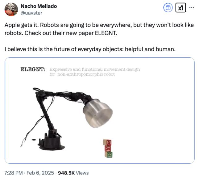 据苹果机器学习网站显示,这个机器人项目被称为“ELEGNT”,全称a, framework of Expressive and functionaL movEment desiGn for Non-anthropomorphic robot,翻译为“非拟人机器人表达和功能运动设计框架”。