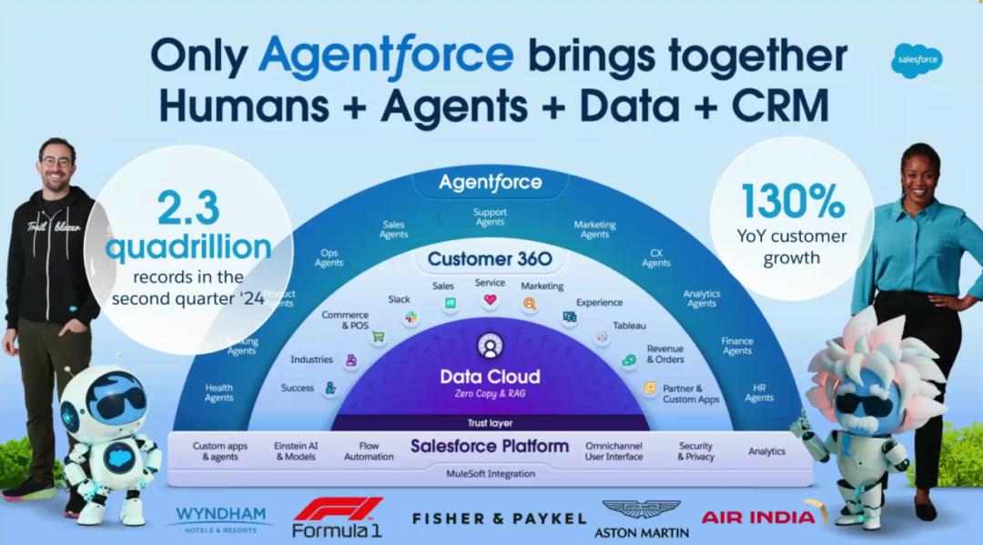 Salesforce于2024年9月推出了一个名为Agentforce的人工智能平台,该平台可在酒店、医院等场景中独立建立Agent(智能体),并且可以24小时不间断地工作。当然,他们也可以和人类合作。