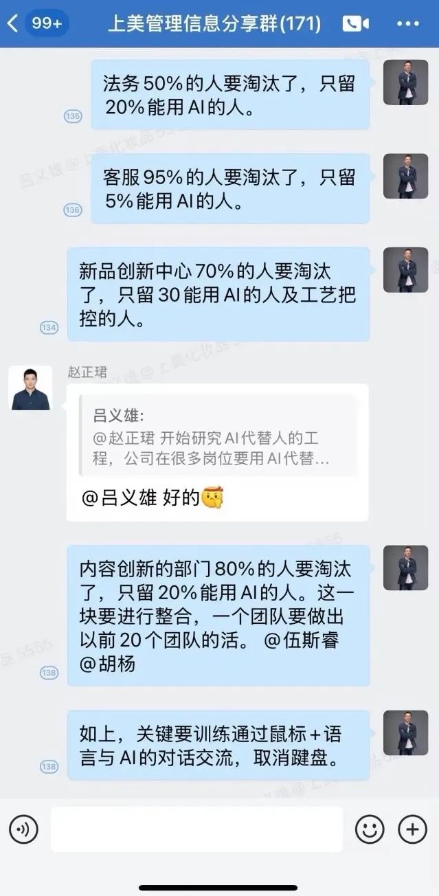 吕义雄在聊天截图中表达了激进的用人策略,也就是说,用AI代替大多数人,只留下少量能使用AI的人。