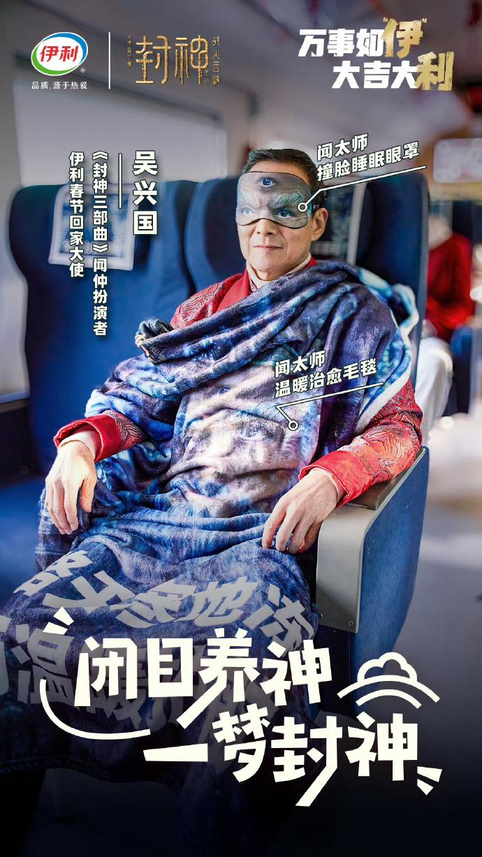 伊利邀请吴兴国作为伊利的“新年回家使者”,分享春节顺利回家的好运,结合电影中闻到太师凯旋返朝的情节和春运高峰回家的热点。与此同时,伊利和《封神2》、吴兴国联合打造了“伊利春节回家礼包”,包括行李套、毯子、电脑包、睡眠眼罩等必备神器。通过抽奖动员网友的参与,加强了闻太师帮助回家的个人设计。