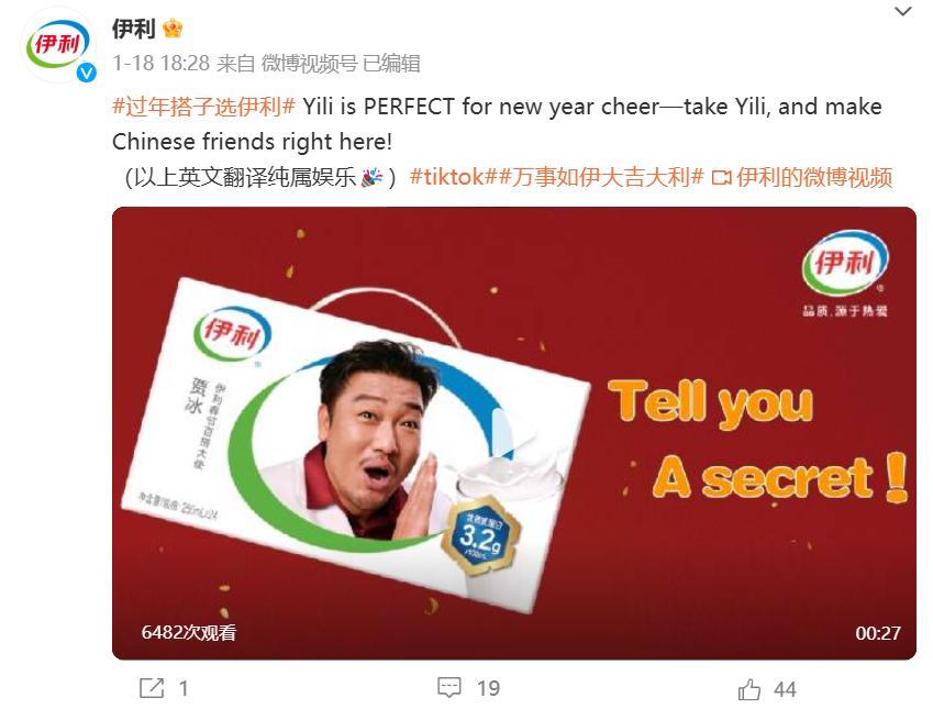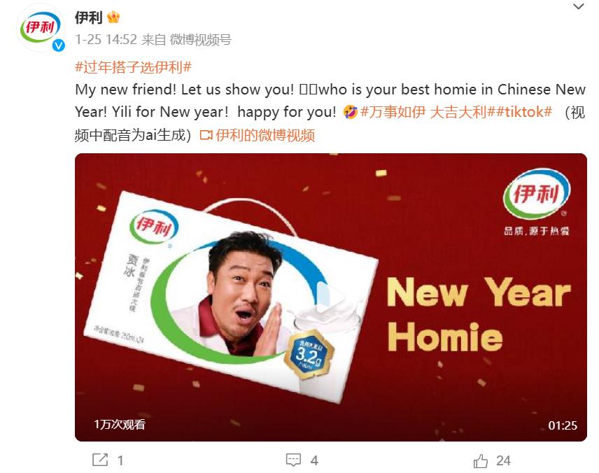 为扩大传播范围,增强传播价值,除了完整的轻松幽默贺岁片外,伊利还发布了贾冰英语OK版和AI配声版短片。,同时也帮助伊利走向世界。