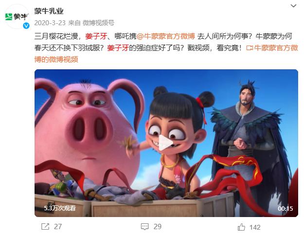 事实上,在2020年《姜子牙》上映之前,蒙牛和国漫已经不是第一次定制广告了,蒙牛品牌形象IP牛蒙蒙与《哪吒1》《姜子牙》进行了梦幻联动。,而且现在这些广告也被许多粉丝发现重温和二创,可以看到长尾效应。
