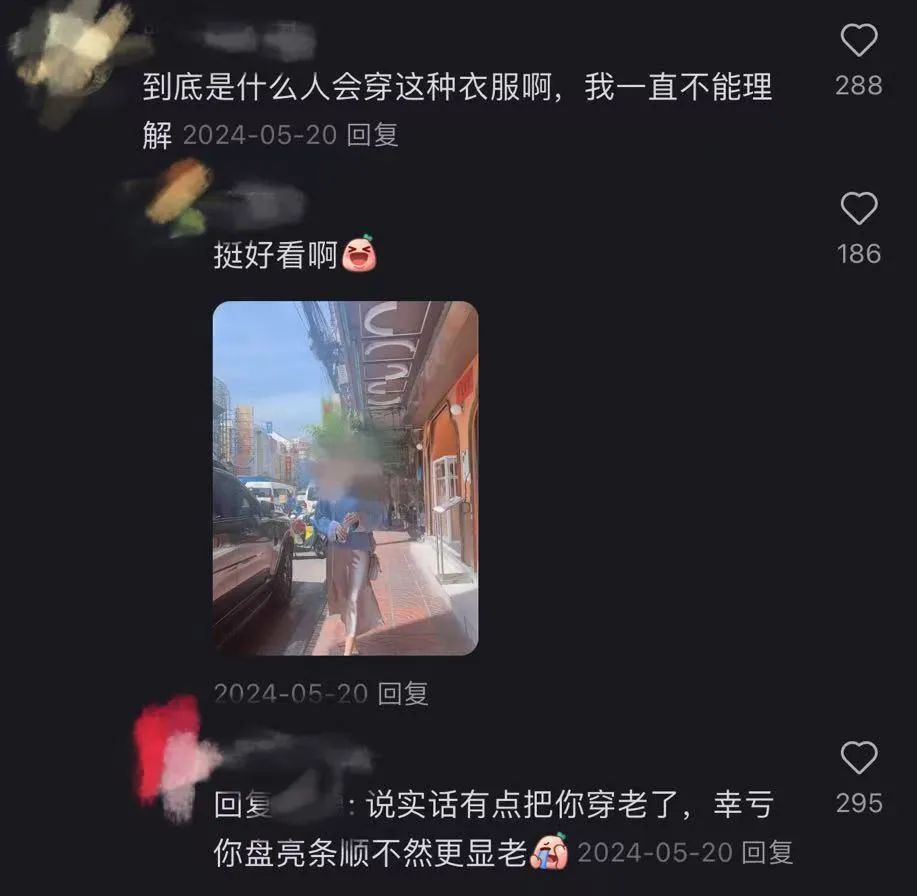 有网友总结说:“骨架大,肩背厚的都不适合穿,穿起来看起来像太奶” "人们说看起来很有钱,实际上是老气" "要把新中式穿得漂亮得背薄脖子长"。