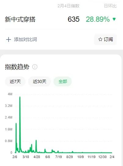 微信指数显示,2024年2月(春节前后),新中式穿搭热度有两波高潮,峰值近400万。从2024年下半年开始,新中式的穿搭热度逐渐消退。到了2025年春节,几乎是“平静”的,即使在过去的30天里,峰值也只有6500,比去年的人气差了600多倍。