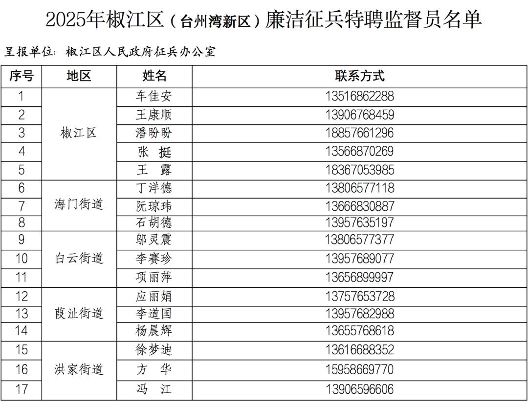 廉洁征兵关系到党、国家和军队的形象,关系到军队的纯粹巩固和战斗力的提高,关系到年轻人和家庭的切身利益。建立廉洁的招聘底线,增强招聘工作的透明度,确保全区招聘工作的公开、公平、公正,是严格的兵员征集纪律规定。现将2025年椒江区(台州湾新区)廉洁征兵监督员及各级监督举报电话公布。欢迎社会各界监督征兵工作。如果发现他人有谎报或隐瞒申请信息,违反廉洁征兵规定,请尽快向兵役机关和廉洁征兵监督员举报。