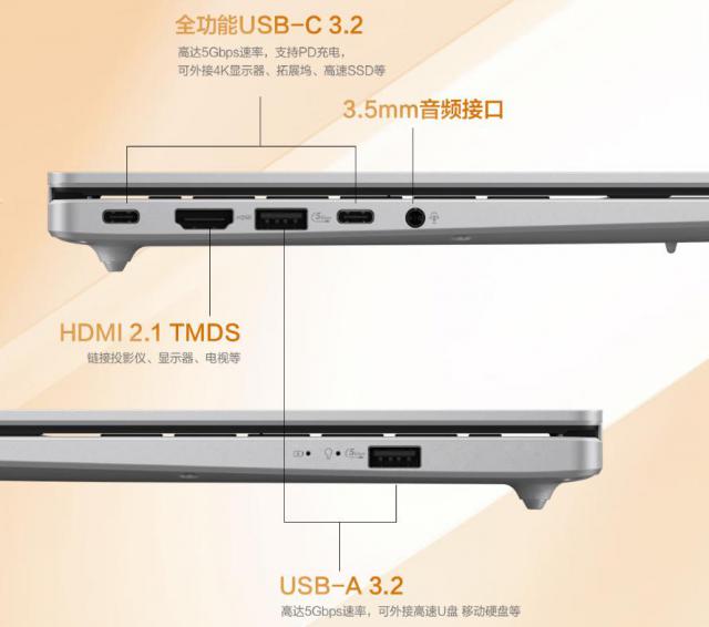 ●再次查看接口和电池寿命。左侧有两种多功能机身。 USB-C 口,支持 PD 还有充电和外部显示功能, USB-A 口,一个 3.5mm 音频口。右边有一个 USB-A 口。目前属于轻薄本常用的双重双重 USB-C 双 USB-A 接口组合,数量类型没有问题,但是规格有限——从其标准参数值来看,有两个。 USB-C 都是 5Gbps 速度,有点尴尬,扩展上限不高。电池电量 42Wh,也不大,属于入门水平,看起来续航不是优势。