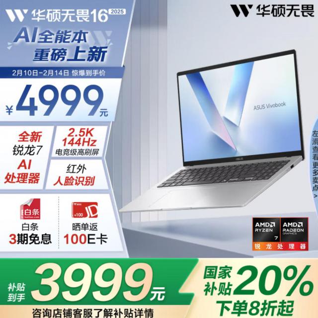 ▲如图所示,这个型号就是华硕无畏。 16 锐龙版 2025。具体硬件参数如下:CPU 是锐龙 7 H 260,搭载 16GB 内存 1TB PCIe4.0 SSD 硬盘组合。有 2.5K 144Hz 高色域高刷屏,首发价格是 4999 部分地区可以享受元 20% 购买补贴,补贴到手价格 3999 元。以下是对该机状况的分析。